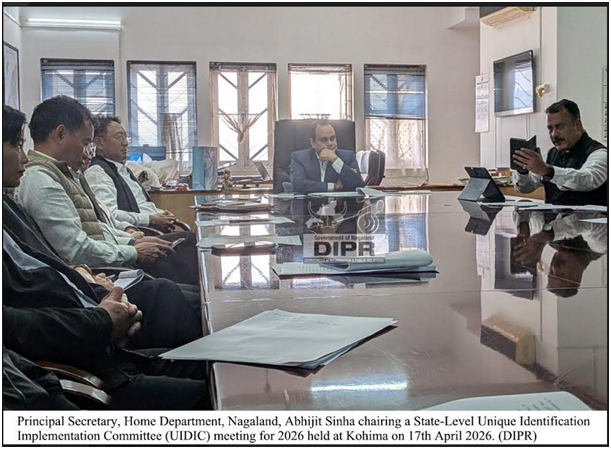 April 17, 2026, 7:06 PM: Itu State-Level Unique Identification Implementation Committee (UIDIC) meeting, 2026 nimitey, loishey, 17th April, 2026 tey, Kohima, Nagaland tey. Itu meeting tohhoiley, Abhijit Sinha, IAS, Principal Secretary, Home Department, Nagaland Government para chair kurialagathakishey, arutateyNgachan Zimik, DDG, Col. Abhishek Koushik, Director, UIDAI Regional Office Guwahati para attend kurialagathakishey, itu Nagaland Government laga senior official khan logotey.