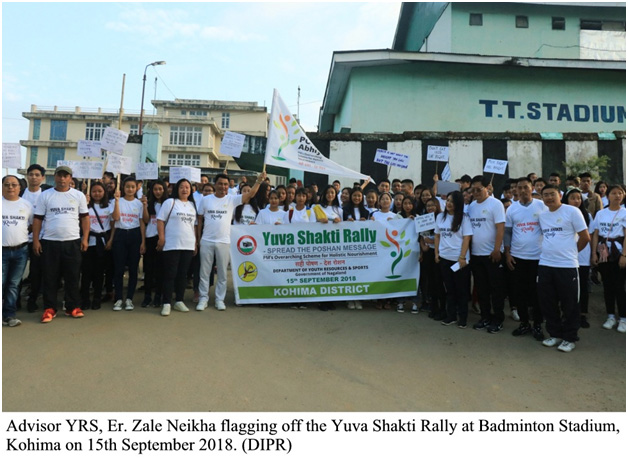 KOHIMA, SEPTEMBER 15 : Poshan (Nutrition) nemite kotha khilaf pora janaide thaka kan 200 jun Volunteers kan alak-alak Colleges laga kan Yuva Shakti Rally te hisha kurikena thakise. Aro etu Rally toh Advisor, Youth Resources & Sports, Er. Zale Neikha pora suru kuridese koise.